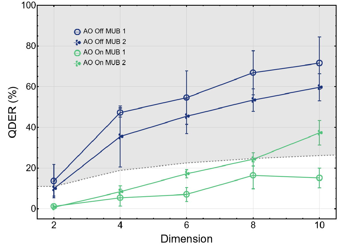 - Error Reduction: We measured the Quantum Dit Error Rate (QDER) across various dimensions. Without AO, the error rates were so high that secure communication was impossible for any dimension greater than d=2.